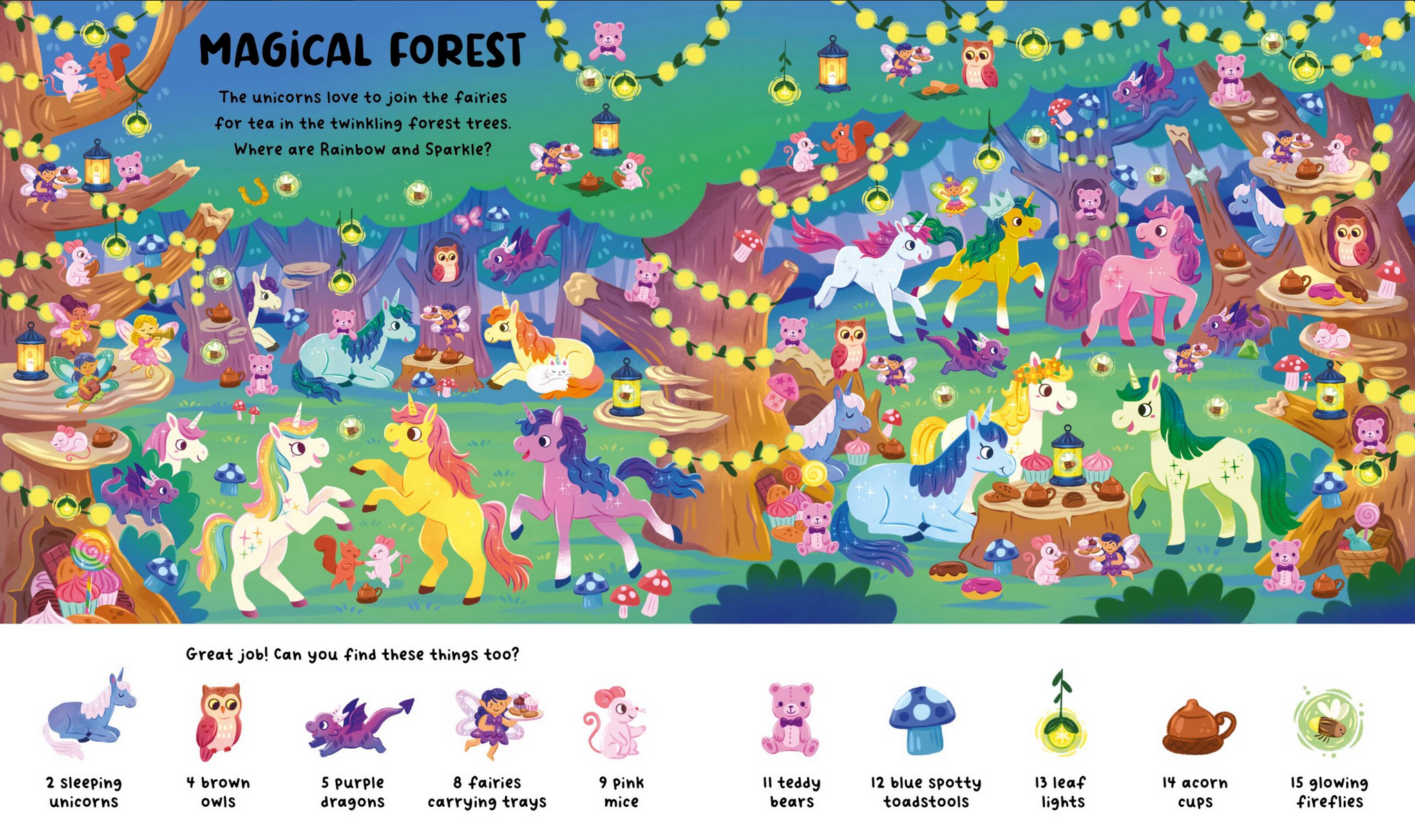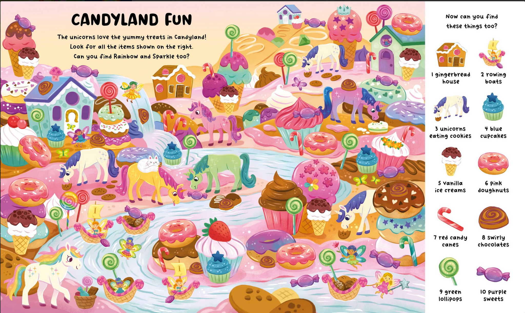 Rainbow and Sparkle are ready to explore! Search for them all over Unicorn Land, and spot lots of other things too. There are 1001 things to find, from dragons to cakes. Can you see them all?