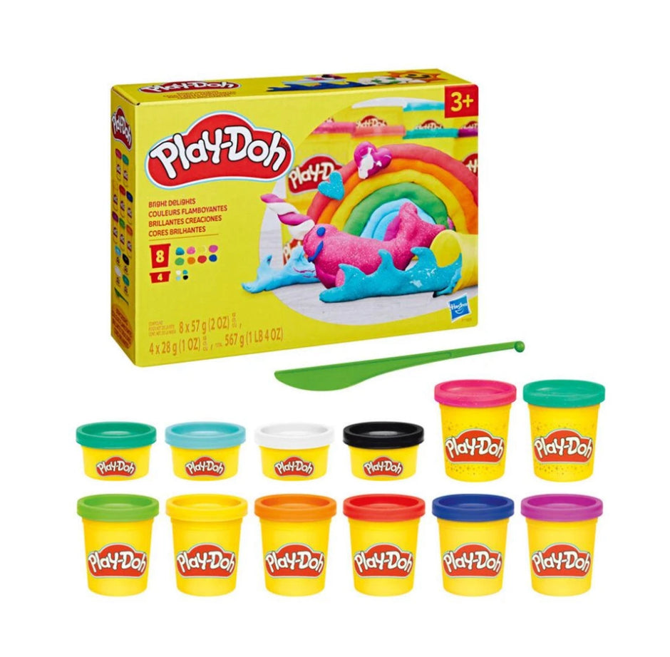 Discover the magic of creativity with Play-Doh Bright Delights! This 12-pack of classic Play-Doh modelling compound comes with 1 and 2-ounce cans in assorted colours, plus a plastic knife to help kids create.