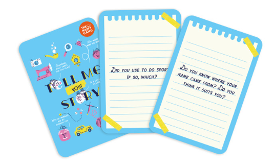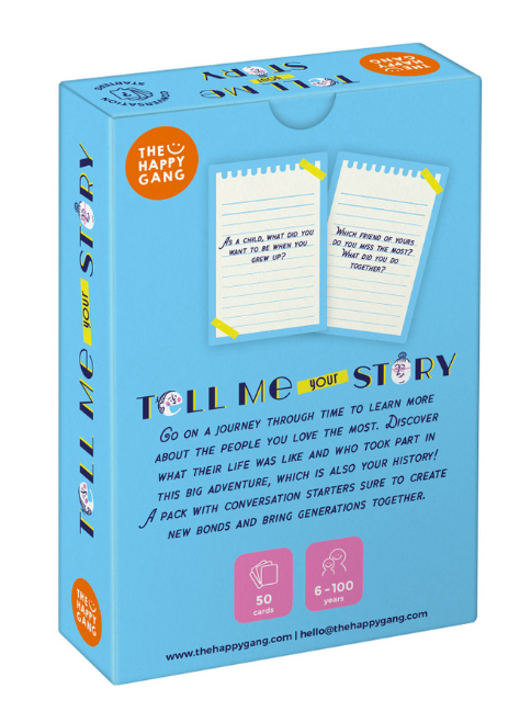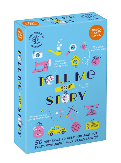 "Tell Me Your Story" by The Happy Gang, a card game with 50 questions to explore the memories of your grandparents.