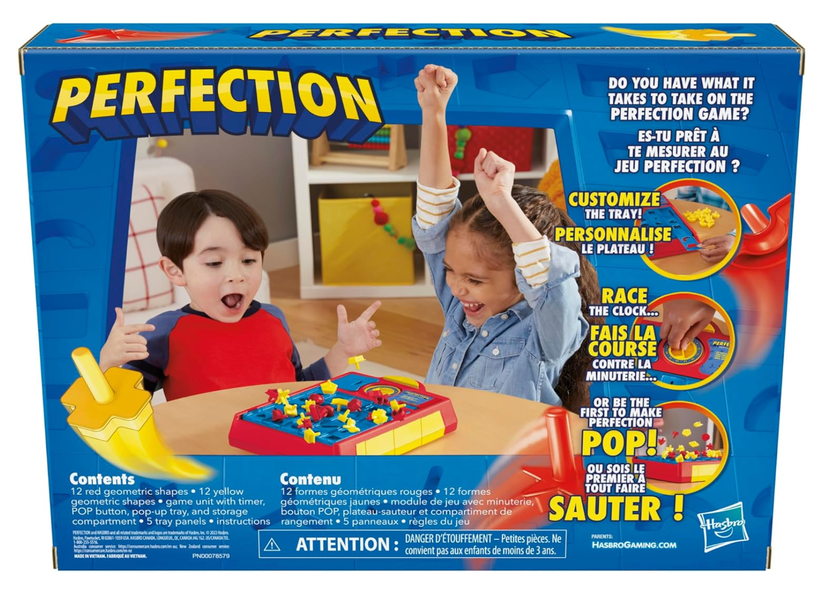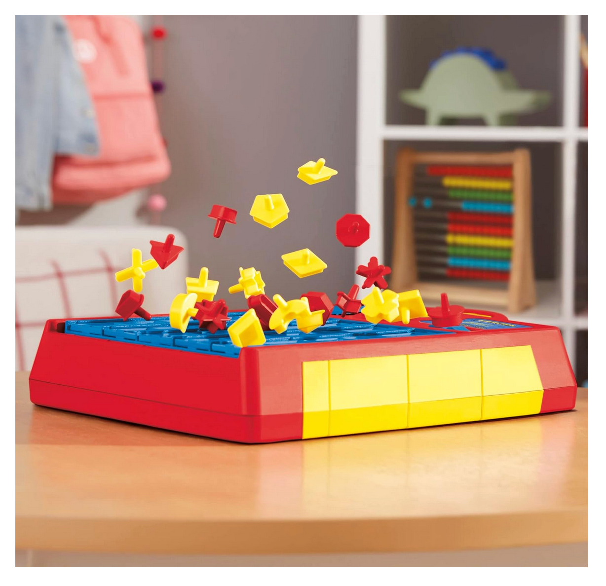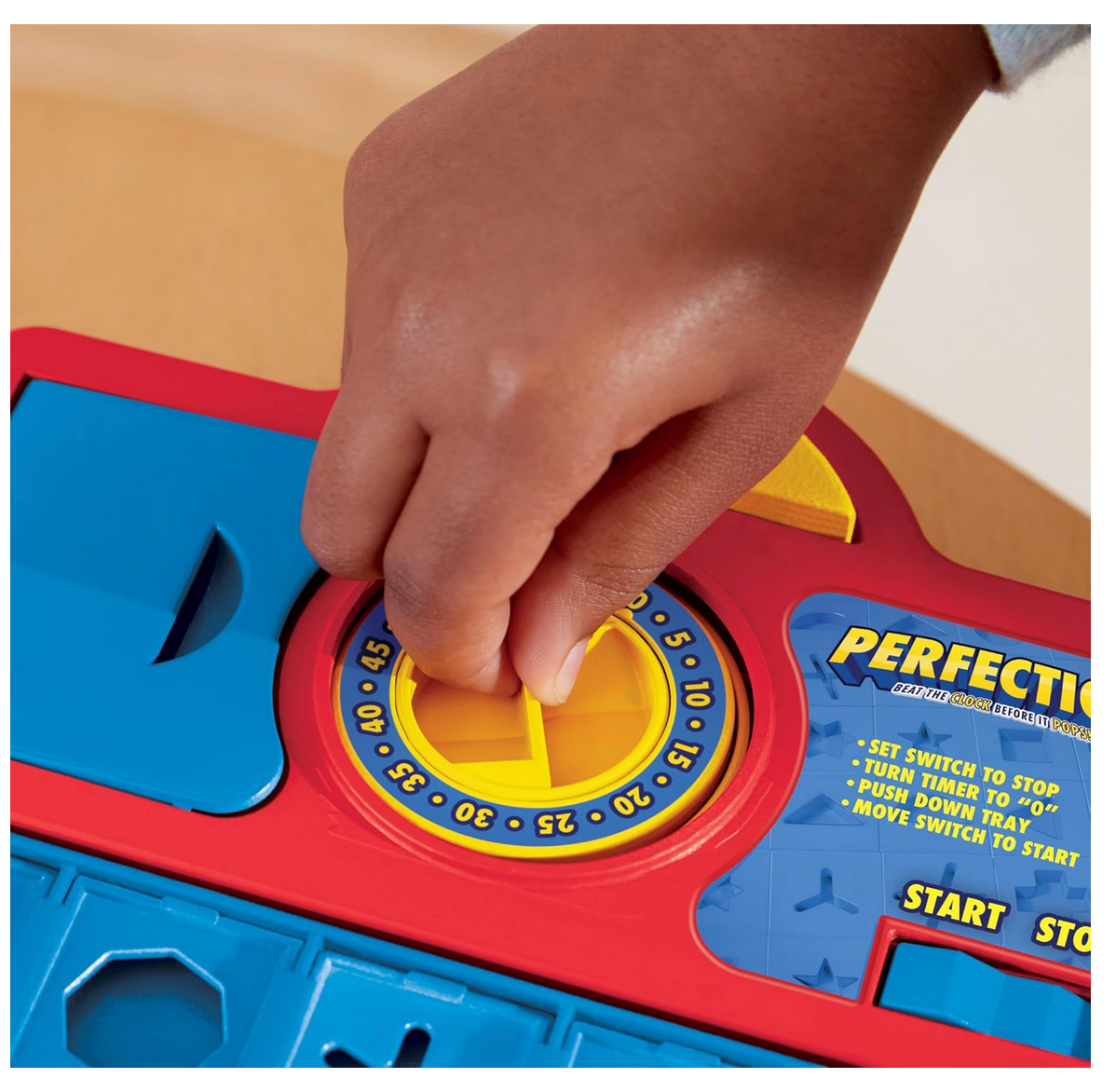 The Perfection game has players on the edge of their seats as they try to beat the clock before the pieces pop! Be the quickest to fit the shapes into their matching holes in the tray. But watch the timer! If it runs out … pop goes the Perfection game! This edition of this fun kids' game of memory lets players customize the trays: rotate them, flip 'em over, and swap them around … there are over 250 different combinations! Players race against the clock before the pieces pop in Single-Player Mode, or play against friends in Multi-Player Mode and be the first to finish and press the pop button themselves. For younger players, play without the timer until they're ready to amp up the action. And, when they're done playing, easily store the pieces inside the game unit. This preschool game is a great choice for playdates, Family Game Night, and indoor fun for ages 5 and up! Perfection and Hasbro Gaming and all related properties are trademarks of Hasbro.