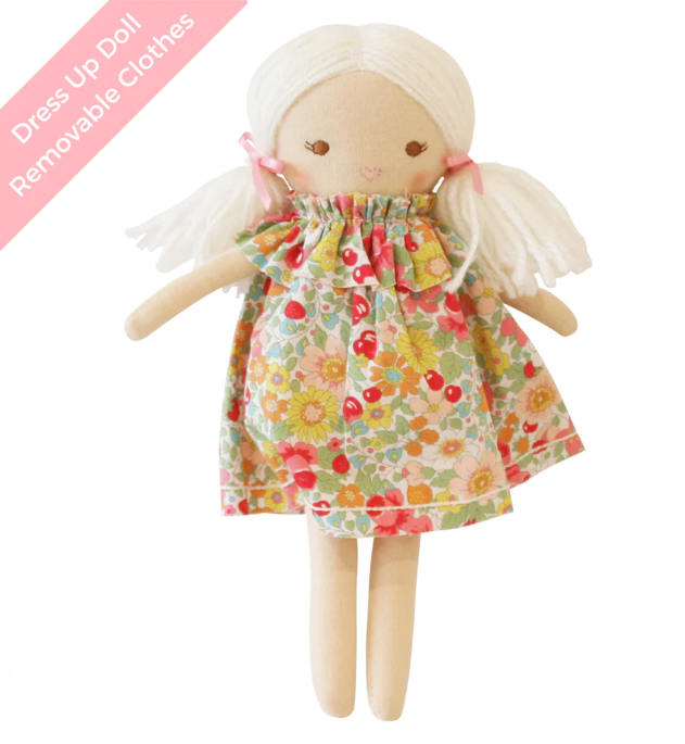 Say hello to Mini Matilda in Spring Blossom — a sunshine-filled sweetheart dressed in a delicate floral frock inspired by spring gardens. With her soft yarn piggy tails and removable dress, she invites little ones into a world of gentle play, big feelings, and endless imagination.