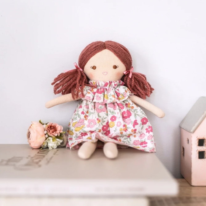 Say hello to Mini Matilda in Rose Garden — the sweetest pocket-sized playmate dressed in a darling floral frock. With her soft yarn hair tied in bouncy piggy tails and her removable Liberty-style floral dress, she’s ready for picnics, pram strolls, and every magical moment little imaginations dream up.