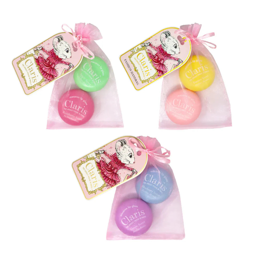 Macarons! Claris's absolute favorite treat! The Claris Macaron Lip Gloss Set features beautifully scented lip glosses. In a set of two you can receive any of these delicious flavors of raspberry, marshmallow, banana, apple, blueberry and grape, how can you ever choose your favorite?