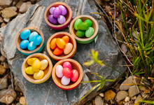 This set consists of 30 eggs representing a variety of shades and colours of the rainbow. The corresponding nest bowls provide the perfect complementary sorting receptacle. The bowls are also stackable, adding more learning possibilities to the play.