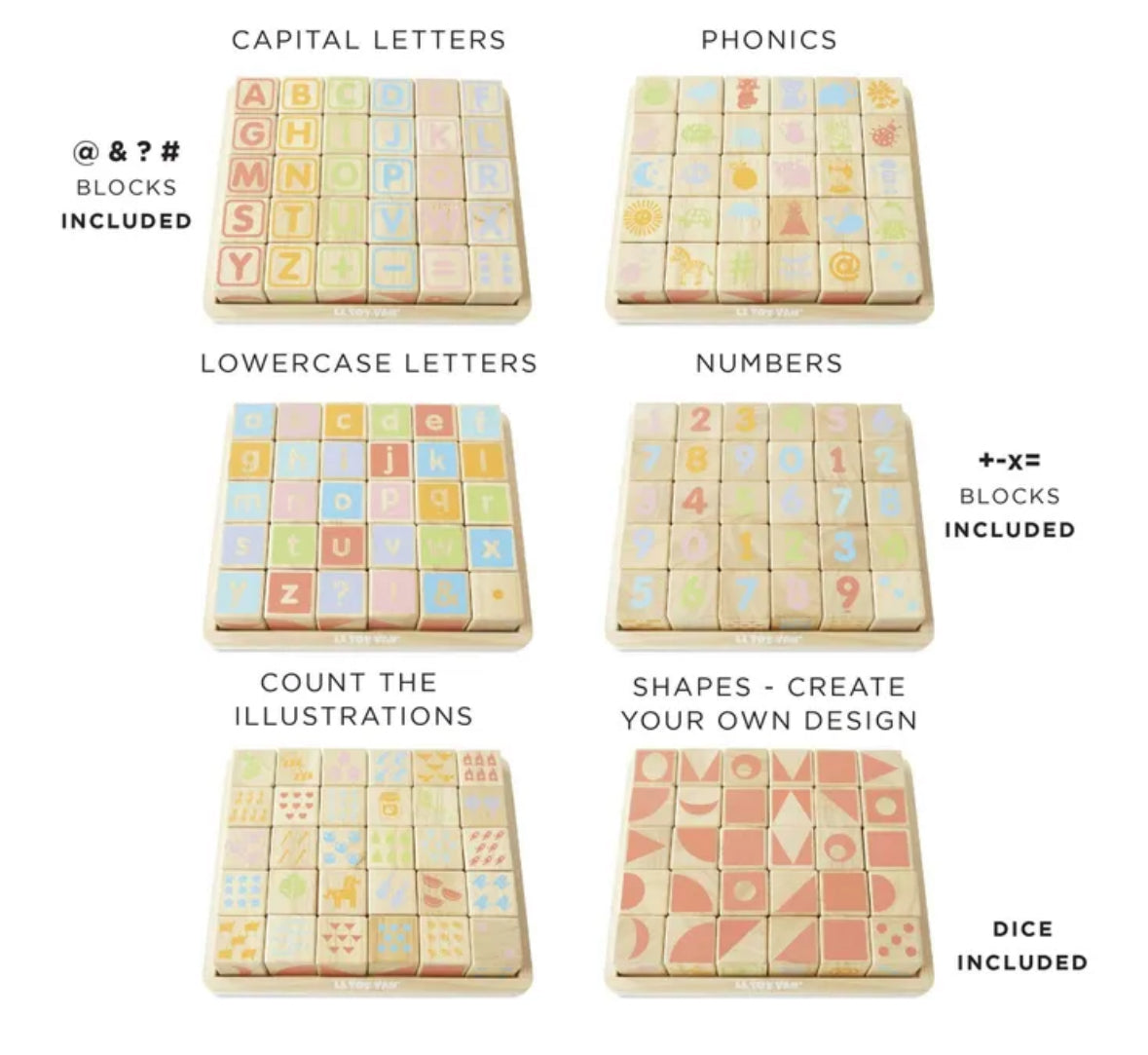 Teach children the alphabet with this cube set , made from FSC™-certified wood. Made up of 30 thick, brightly-colored wooden pieces with smooth edges, this set is designed to withstand many years of play and comes with a handy wooden storage tray.