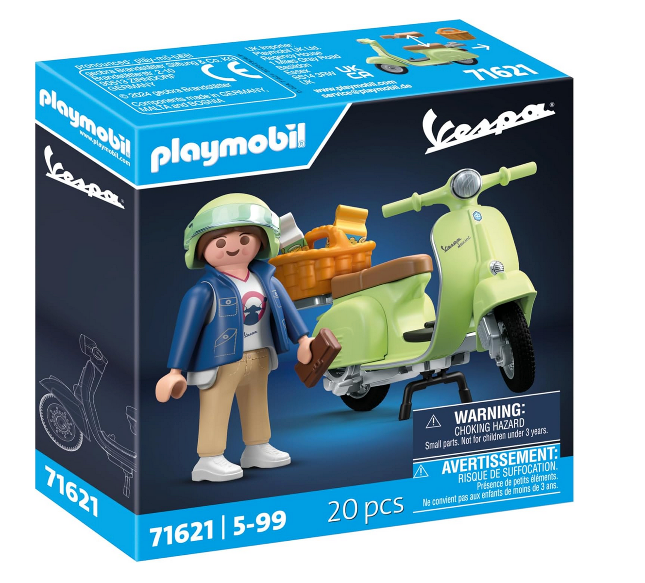 Get on the 1969 Vespa 150 Sprint Veloce in light green by PLAYMOBIL Inspired by the Piaggio scooter model Vespa 150 Sprint Veloce, this authentic Playmobil Vespa charm combines with timeless elegance. The lovingly designed Vespa is completed by a Playmobil figure and a variety of accessories. Groceries and wallets can be stored in the basket behind the seat. Thanks to the different saddle variants, with and without figure seat, the scooter can be individually designed. Whether experienced riders or beginners, this set is perfect for children and adult Vespa fans. Experience the spirit of the road with the iconic 1969 Vespa 150 Sprint Veloce in light green by PLAYMOBIL.