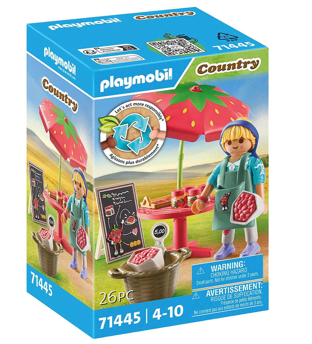 Indulge in the delightful world of the PLAYMOBIL Country Homemade Strawberry Jam Stall – where role-play is a piece of cake! Designed for children aged 4 years and up, this berry-luscious set is made from over 80% sustainable material, putting the planet first. Visit the strawberry stand and taste the sweetness of fresh-picked strawberries. Don't miss out on the scrumptious strawberry cake and tangy strawberry jam. With one PLAYMOBIL figure and a handle-equipped bag filled with fresh strawberry inserts, it's time to jam and have a fruitful playtime adventure!
