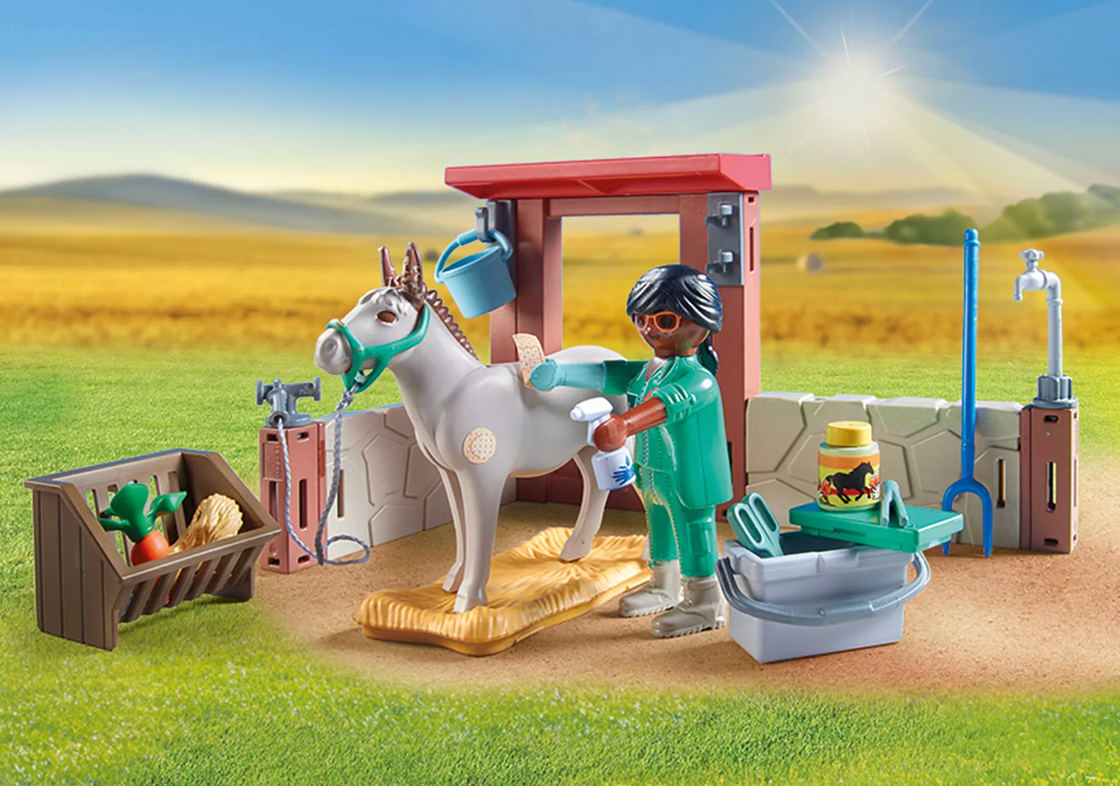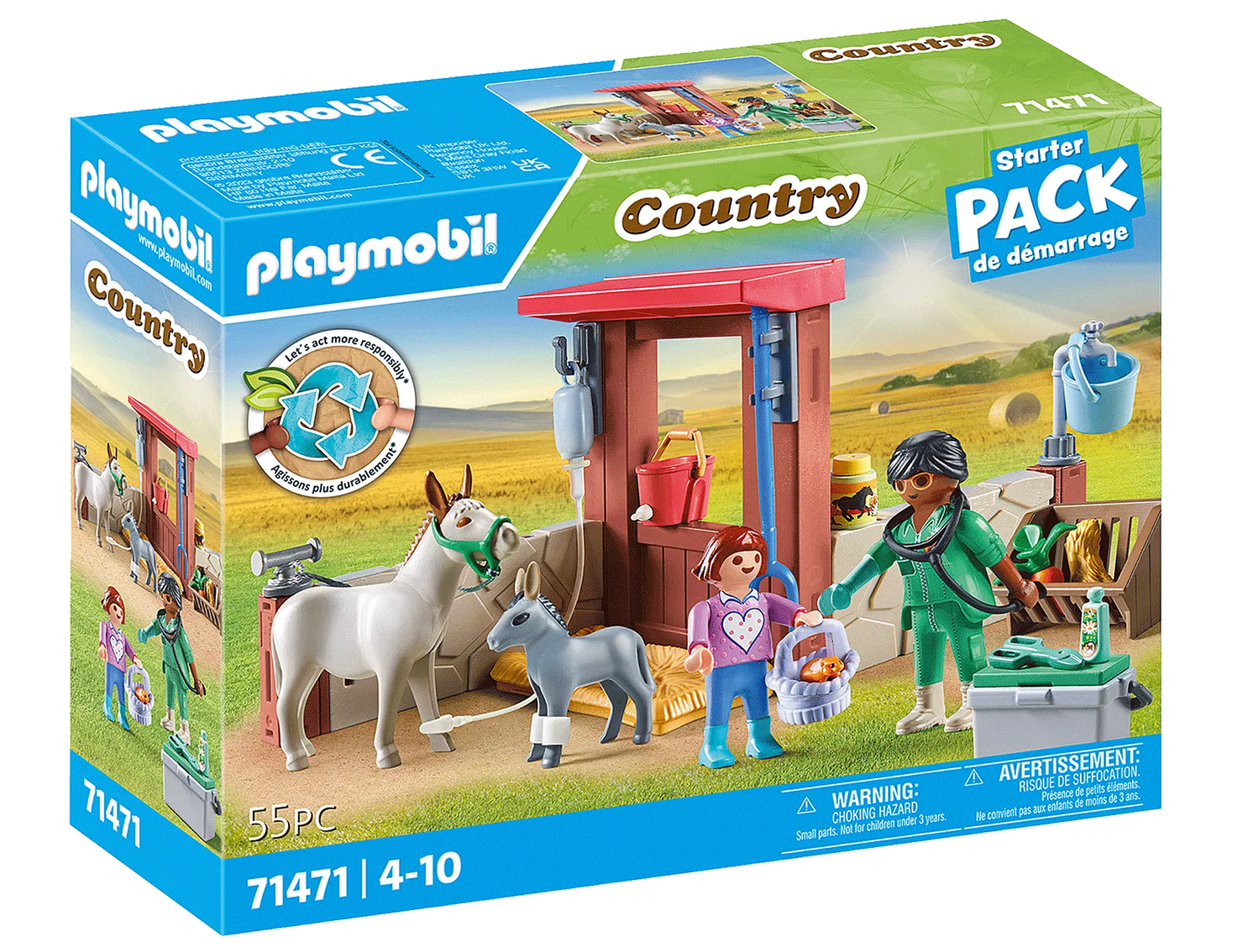 Aid the veterinarian in caring for the donkeys with the Playmobil Starter Pack Farmyard Veterinarian. The doctor gently examines the donkey foal under the watchful eyes of the mother. Fortunately, the sick animal can be helped quickly. Next in line is the little hamster. The veterinarian always has a lot to do. The fantastic Playmobil Starter Packs invite children to dive directly into the diverse world of Playmobi;l. The sets include play figures and matching accessories from popular Playmobil worlds, are quickly assembled, and immediately ready play. Good for the environment: The playset is made up of more than 80% sustainable materials.