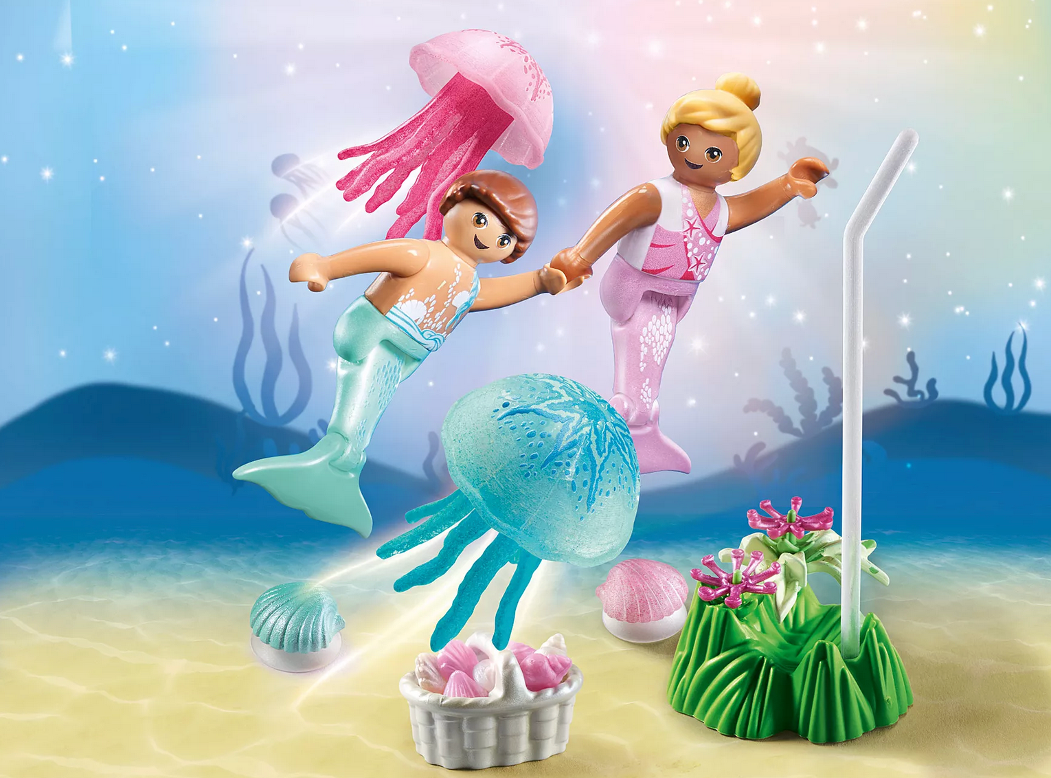 Dive into fun adventures with the Little Mermaids with Jellyfish from PLAYMOBIL. On the ocean floor, the two mermaid children search for shells and collect them in their basket. Curiously, they watch the two large jellyfish swimming by in the distance. The Princess Magic Mermaid World by PLAYMOBIL invites children into a magical underwater realm. The lovingly crafted figures and animals inspire children aged 4 and up to embark on ever-new imaginative adventures. The play figure set includes two child figures, two jellyfish, sea flower, underwater plant, basket, and many other fantastic extras. The jellyfish can be attached to transparent rods for "swimming.