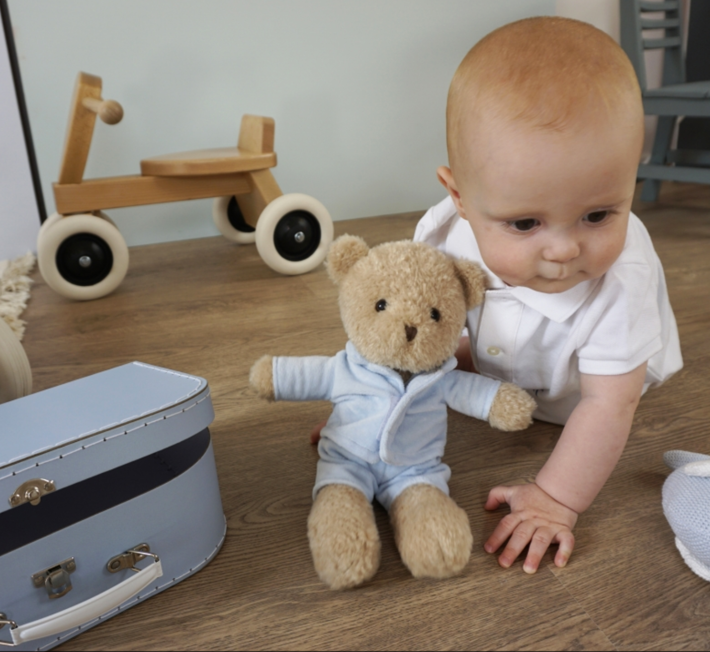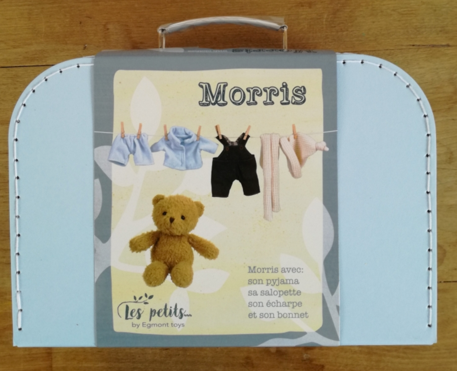 Morris, a very soft and lovely teddy bear is hidden in the little case. Peekaboo, here he is in his overall. He just has to put on his bonnet and scarf to go for a walk with Tom. Later, in the evening, he puts on his pajamas to go to bed. The small hand sewn case is the best hiding place.