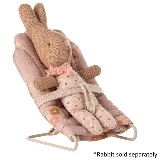 Make space for sweetness with the Maileg Babysitter My in Rose, perfectly designed for your tiniest Maileg companions. Featuring a soft pink floral print, this charming babysitter includes a scallop-edged padded cushion and a fabric harness to keep baby mice or My-sized bunnies and rabbits cosy and secure. With its delicate tones and vintage-inspired detailing, it adds a lovely touch to any Maileg nursery scene. A delightful accessory for imaginative, storybook play. Measures H8cm x W6cm.