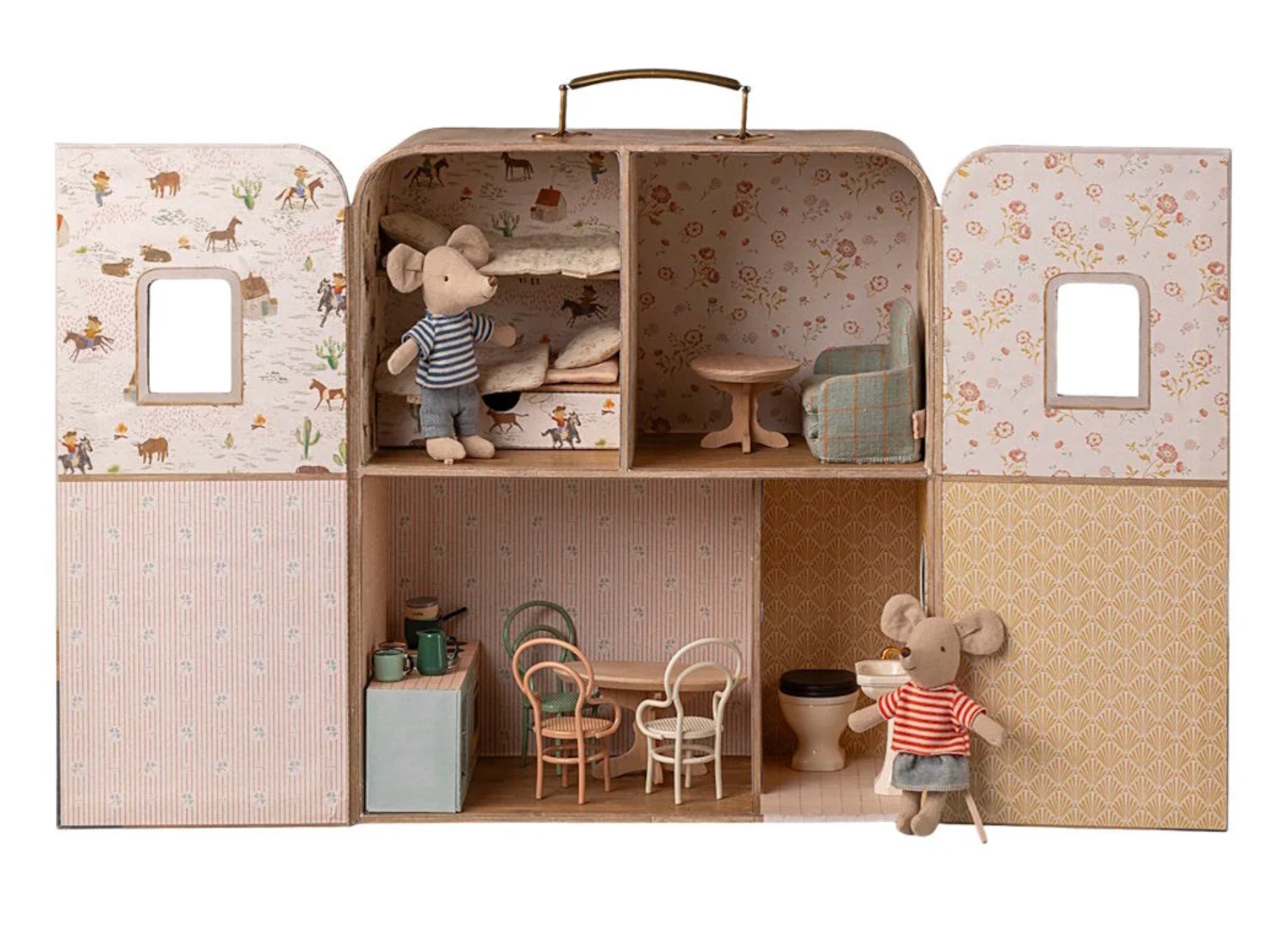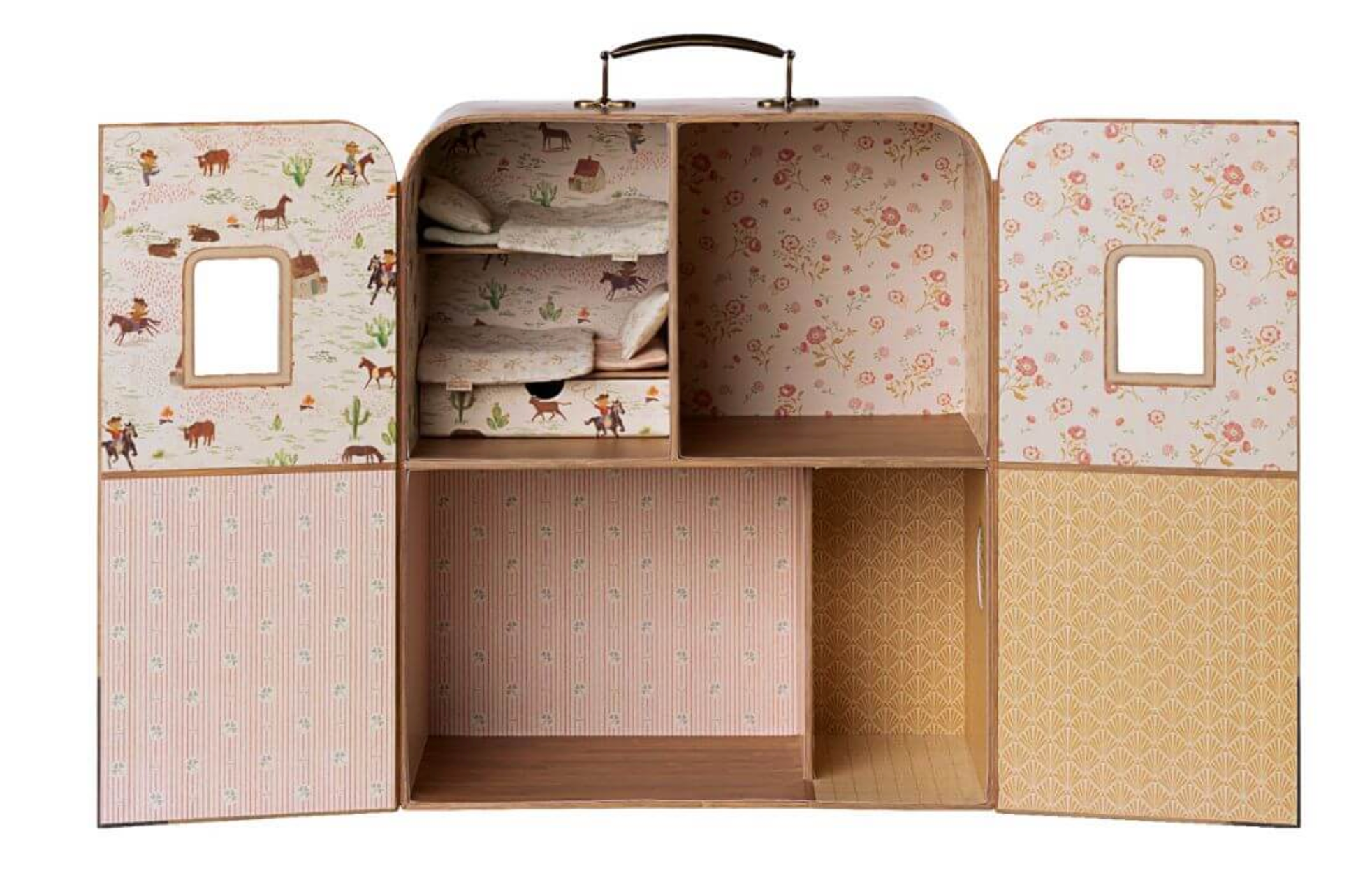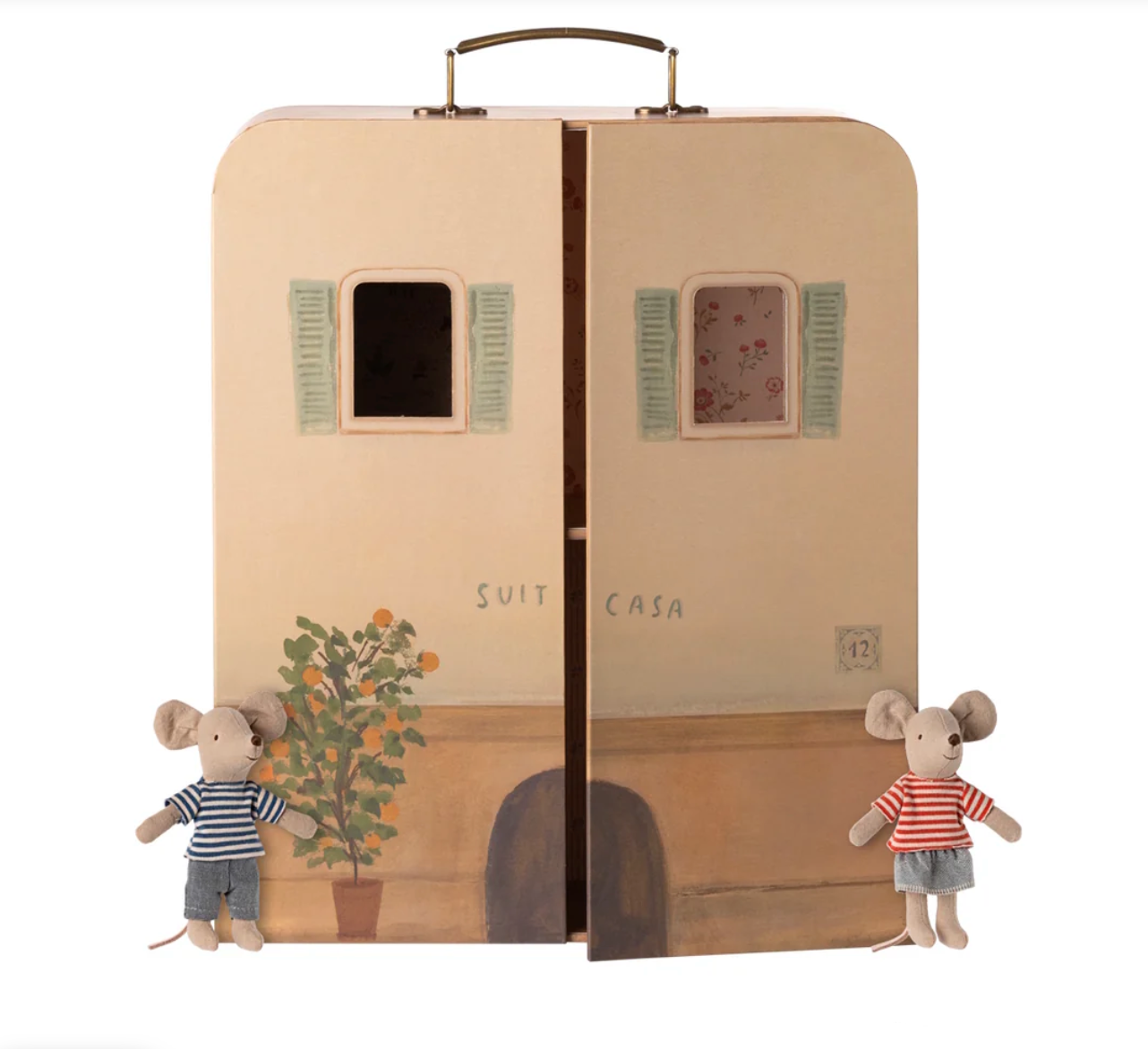 Create enchanting adventures wherever you go with the Maileg SuitCasa Portable House. This beautifully illustrated, fold-open case transforms into a delightful dollhouse, featuring four cosy rooms, two open windows and Maileg’s signature vintage wallpaper prints. Thoughtfully designed for portable play, it includes a sturdy carry handle and magnetic closures to keep everything safe and secure inside.