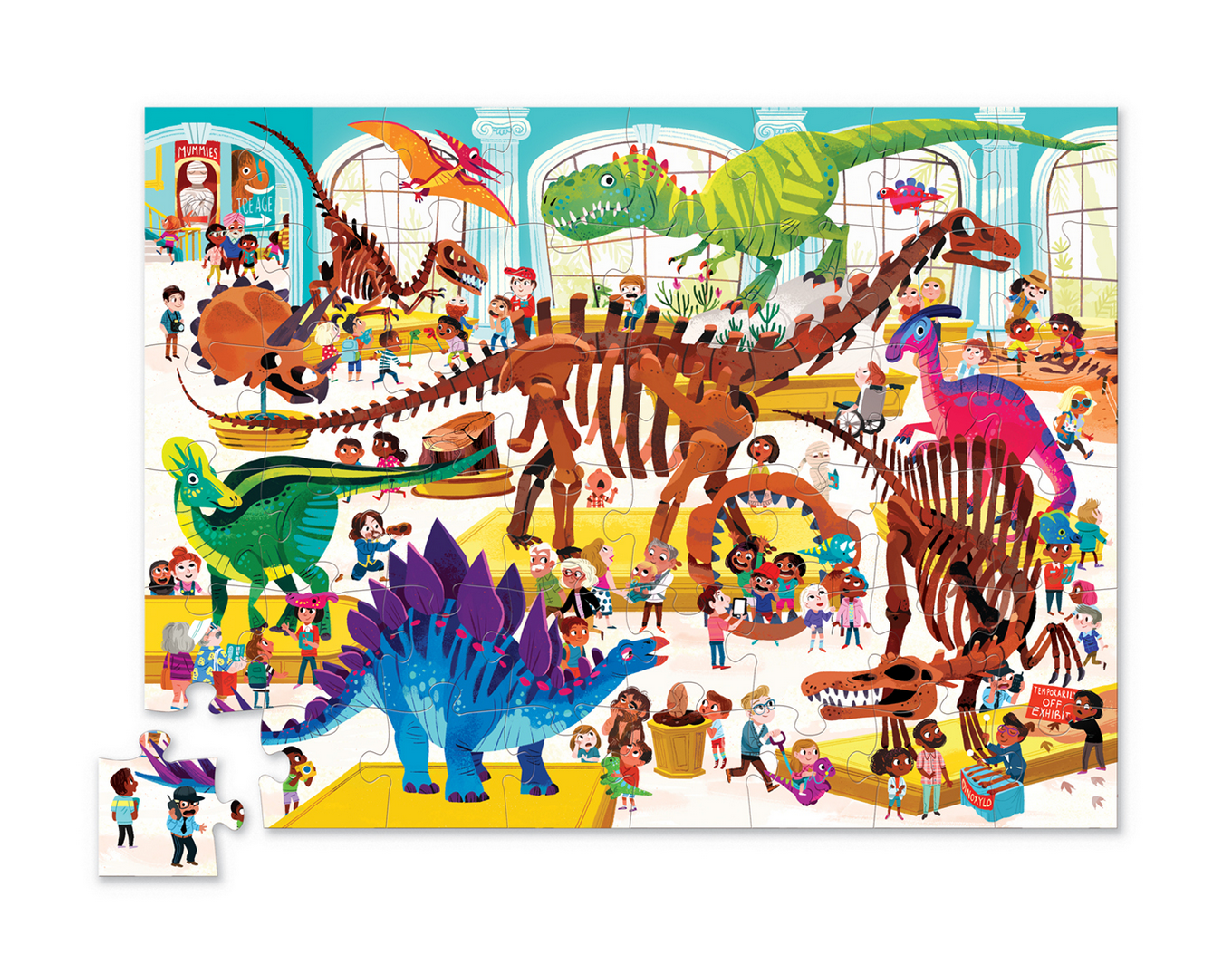 Crocodile Creek's Day at the Museum 48-piece puzzle will transport you to a fun, whimsical museum. This observation puzzle features a great level of illustrative details that takes into account all the activities that happen in a museum! This observational and humorous puzzle is 18" x 24" when complete. The uniquely shaped packaging makes storing this puzzle even more fun. Suitable for ages 4+